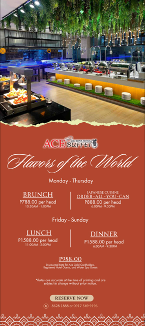 Situated at the ground floor offering the view of Ace Water Spa. Ace International Buffet serves only curated menu with the freshest ingredients to satisy the most discerning palate. With stations such as Japanese, Shabu-Sabu, Grilling, Pasta and Noodle Bar, Dessert and Beverage combined with hot and cold menu selection, eating is always a remarkable dine-in experience.